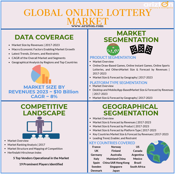 CHICAGO, IL, UNITED STATES, October 9, 2018 /EINPresswire.com/ -- Arizton's market research report on the global online lottery market offers analysis on market size & forecast, market share, industry trends, growth drivers, and vendor analysis. The market study also includes insights on segmentation by product (online draw-based games, online instant games, online sports lotteries, and others), by platform (desktop and mobile/app-based), and by geography (APAC, North America, Europe, Latin America, and MEA)