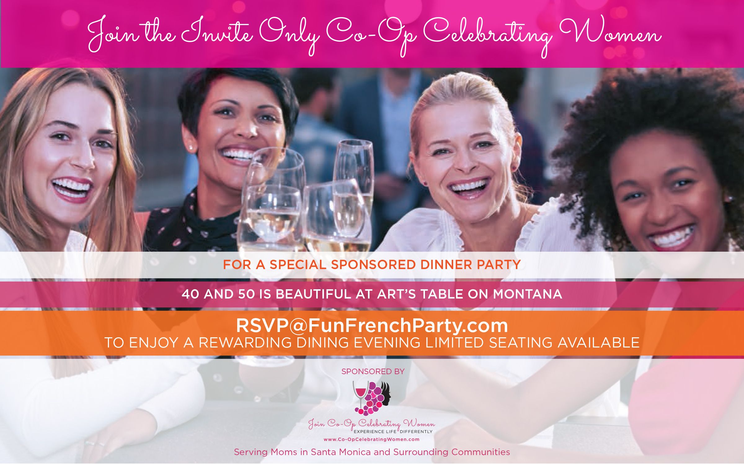 According to Co-Op Celebrating Women Founder, Carlos Cymerman, "We love to celebrate Westside moms who are between 40 and 50 years (plus) young, that love to make a difference, and meet like-minded women. We're hosting an intimate dinner event, to be inspired, enjoy delicious food, and have the time of our life."
