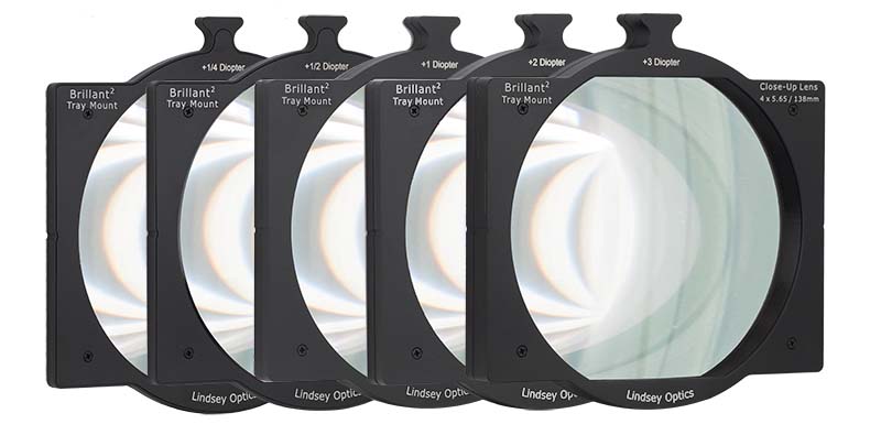 The Brilliant² Tray Mount Close-Up Lenses use Lindsey Optics 138mm Close-Up Lenses (Diopters), permanently mounted in 4"x5.65" trays, which gives a 5.1" diameter clear aperture in the tray, allowing use with large lenses and wider-angle lenses. The tray is masked at the top and bottom to prevent stray light entering the 4x5.65 matte box.