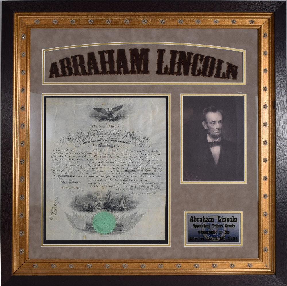 A pair of Abraham Lincoln lots is expected to do well. One is a signed document, from August 1861, appointing Fabius Stanley a Commander in the U.S. Navy. The document, with a vignette and green seal, is also signed by Navy Sec. Gideon Welles. Stanley helped out in the Civil War by protecting and holding Fort Taylor in Key West, Florida, with his steamer ship Wyandotte.
