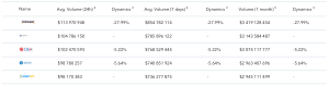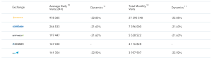 The leader in this category is Binance, whose monthly trading volume is 20 842 258 678, USD (+14.45%), month to month period.