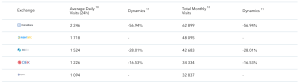 The leader in this category is Binance, whose total monthly traffic is 27 392 540 (-22.05%) visits, month to month period.