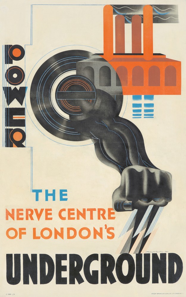 Poster by E. McKnight Kauffer titled Underground / Power (1931), in a 24 3/8 inch by 39 inch frame, printed by Vincent Brooks, Day & Son (London) (est. $12,000-$15,000).