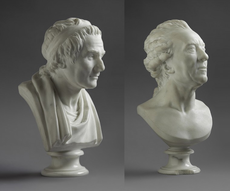 Houdon’s work is characterized by a sense of realism and a lack of idealism. He’s able to capture the transient expressions of his subjects, with a seravezza marble bust of Georges-Louis Leclerc, Comte de Buffon, 1789, 11 ½” tall; and a seravezza marble bust of Jean-Jacques Rousseau, 1788, 10 ¾” tall, both of which were archived in the Frick Art Reference Library in 1932.