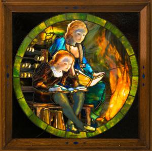 Wonderful 1897 Tiffany Studios (N.Y) window depicting two children reading by the fire, (est. $40,000-$60,000)