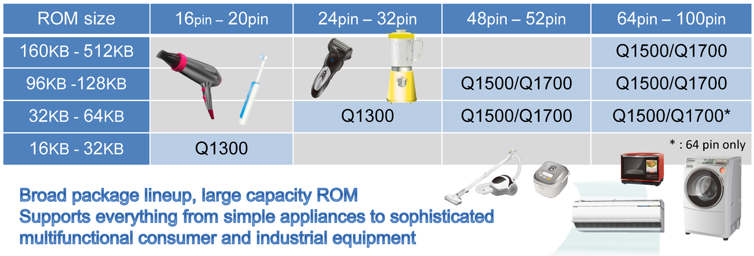 Microcontrollers used in home appliances and small industrial equipment in the rapidly growing Asian market require a wide variety of package types and program ROM capacities to quickly meet the constantly evolving needs of applications that progressively add new features and functions while delivering improved performance. And since many of these devices are used on a daily basis, safety is becoming an increasingly important factor, requiring that MCUs which comprise the core of home appliances include safety functions that can control the system under all conditions.