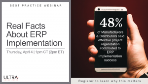 OAK BROOK, IL, UNITED STATES, March 15, 2019 /EINPresswire.com/ -- Ultra Consultants, Inc., an independent research and enterprise solutions consulting firm serving the manufacturing and distribution industries, presents an industry showcase webinar “The Real Facts About ERP Implementations” perfect for project teams from manufacturing and distribution companies.The one-hour webinar is scheduled for Thursday, April 4, 2019 at 1 p.m. CT (2 p.m. ET). Hosted by Ultra Consultants CEO and Founder Jeff Carr with Ultra’s Center of Excellence Director Andrew Bolivar, attendees will take away actionable data obtained from a recent industry survey looking at ERP implementation success rates.