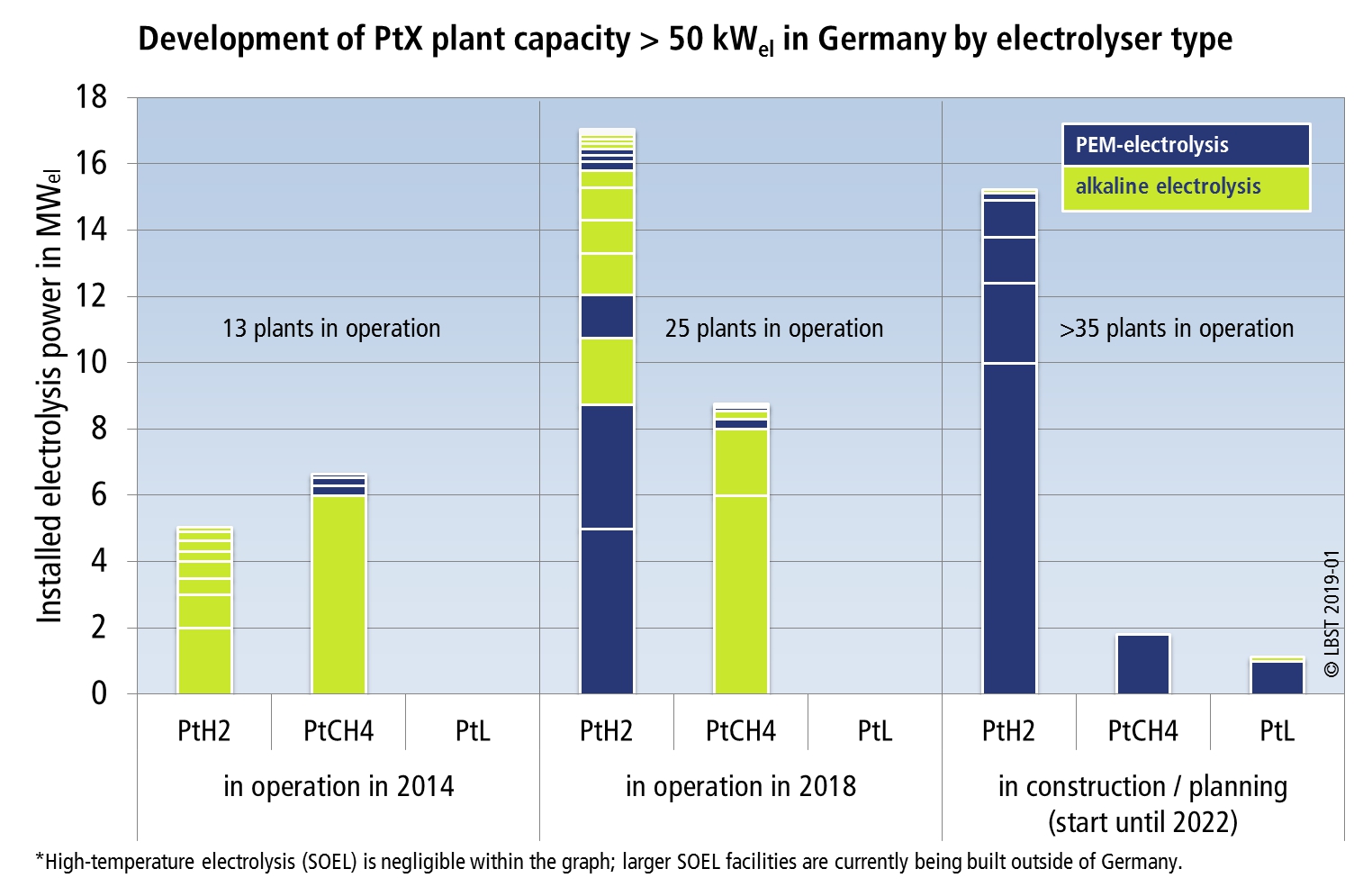 The number of PtX projects has shown a marked increase and 35 plants are expected to be in operation by 2022 in Germany alone. At present, the total installed electrical power of the PtX plants is at 26 MW and has more than doubled since 2014. The majority of projects use so-called PEM electrolysers having certain advantages regarding dynamic operation compared to the incumbent alkaline electrolysis technology. Projects using high-temperature electrolysis, which is particularly suitable for power-to-liquid (PtL) processes, are mainly planned outside of Germany. Noteworthy for the German projects is a growing focus on the generation and use of hydrogen without further processing it into other energy carriers. This is a result of the increasing application of green hydrogen e.g. as a feedstock in refineries or as a fuel in the mobility sector.