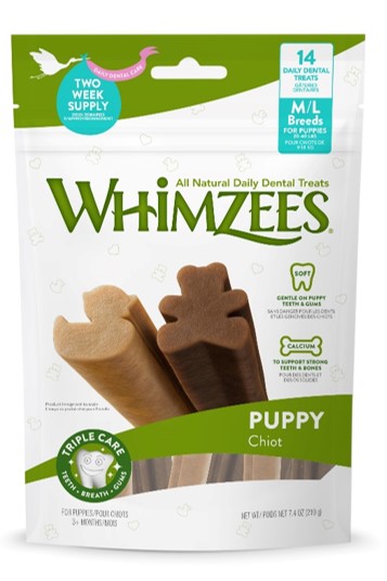“While we wish our puppies could stay young forever, they grow quickly, and it’s important we help support that growth early on to set the foundation for a happy and healthy life,” says Lauren Brecher, WHIMZEES Brand Manager. “Our new daily dental chews for puppies mean we can make proper dental care part of the routine earlier than ever – and of course have some fun in the process to evoke lots of tail wags and puppy kisses from our new furry family members!”