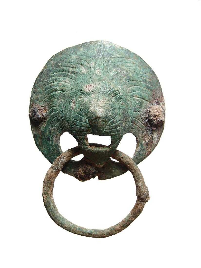 Roman bronze lion mask door knocker, circa 1st-3rd Century AD, nicely detailed and patinated, an attractive example of a decorative door device that persists to this day (est. 1,000-$1,500).