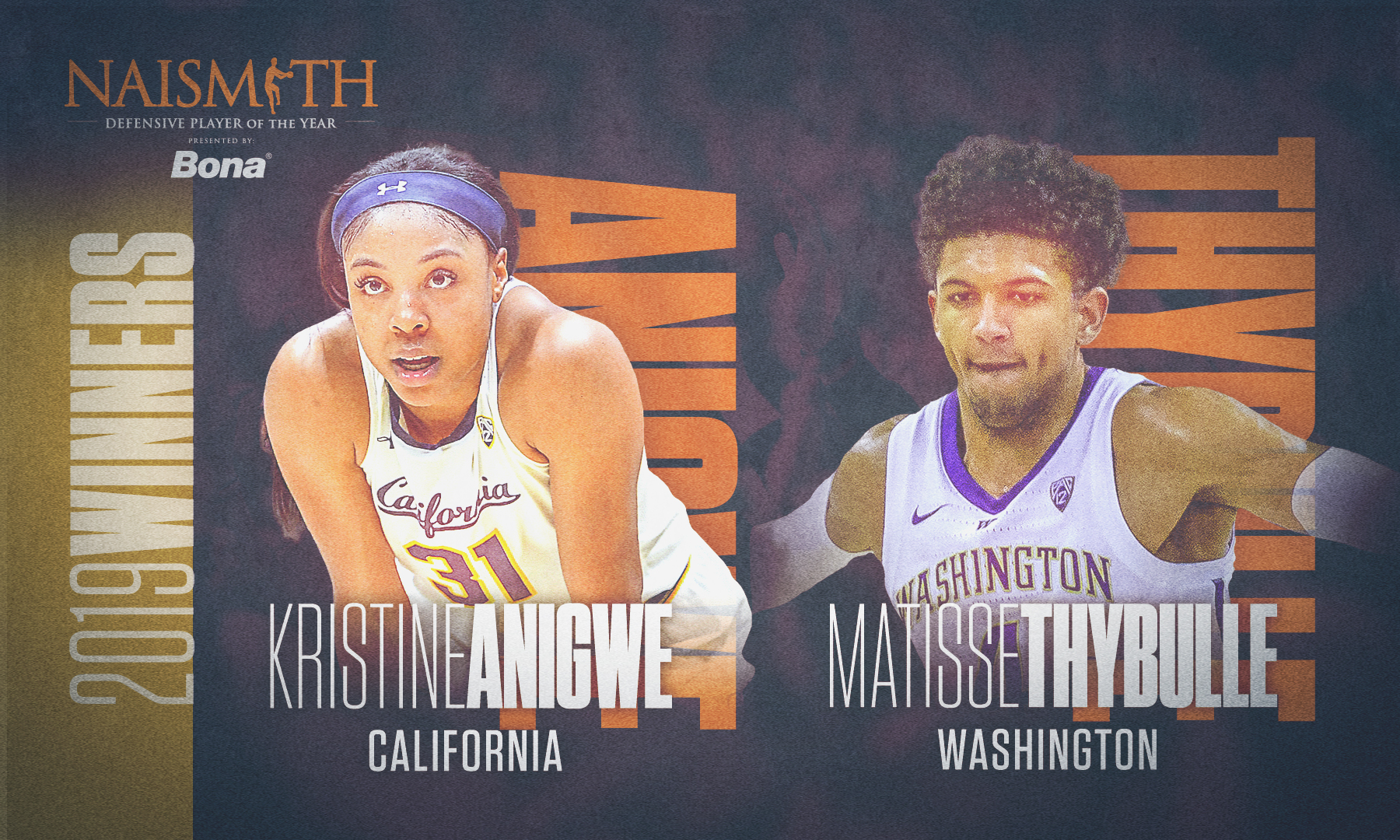 Atlanta, GA, April 07, 2019 (GLOBE NEWSWIRE) -- ATLANTA (April 7, 2019) – The winners of the 2019 Naismith Defensive Player of the Year Award presented by Bona for men’s and women’s basketball both hail from the Pac-12 Conference as Matisse Thybulle (Washington) and Kristine Anigwe (California), respectively, claim top honors in the second year of this award. The winners were announced today by the Atlanta Tipoff Club, as Thybulle was honored at the Naismith Awards Brunch presented by Mortenson, edging out the other finalists, Brandon Clarke (Gonzaga), De’Andre Hunter (Virginia) and Zion Williamson (Duke). Anigwe will be honored at her school at a later date. She takes home the win over fellow finalists, Lauren Cox (Baylor), Ae’Rianna Harris (Purdue) and last year’s winner, Teaira McCowan (Mississippi State).