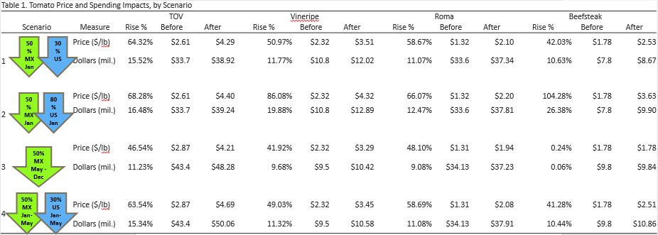 In January, in addition to disease loss, domestic supplies also are prone to reductions due to freeze or frost. In a more extreme case in which a 50% reduction in January imports from Mexico and an 80% reduction in U.S. production occur simultaneously, price increases for vine ripe tomatoes are expected to be up over 86%, from $2.32/pound (pre-duty) to $4.32/pound.