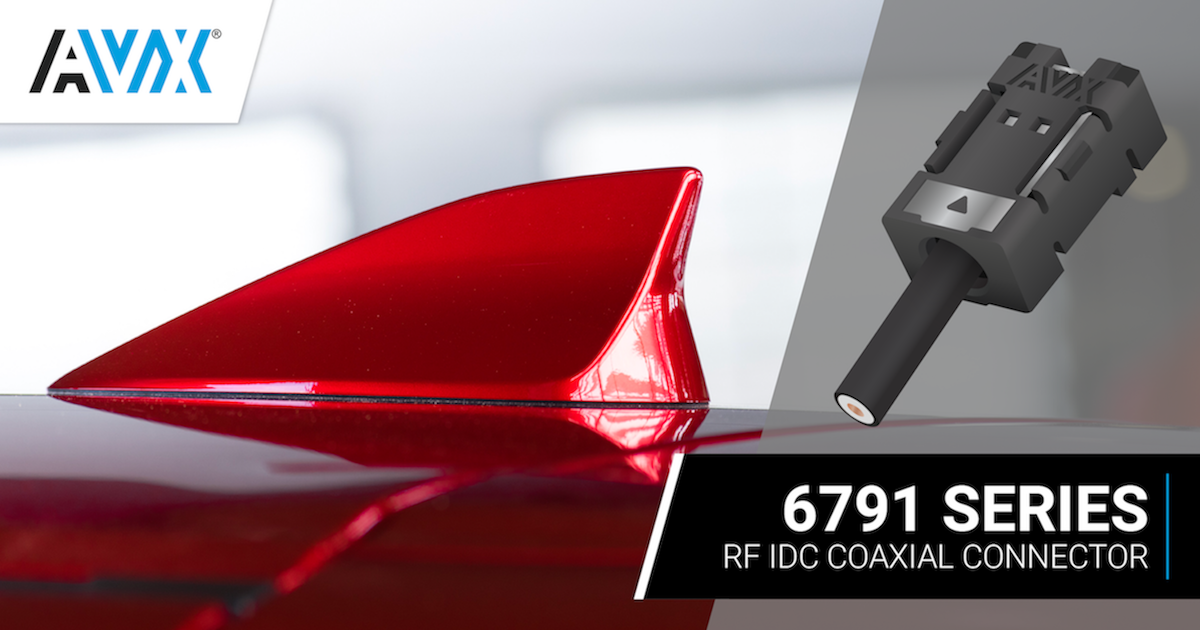 AVX Corporation, a leading manufacturer and supplier of advanced electronic components and interconnect, sensor, control, and antenna solutions, has released the first wire-to-board RF coaxial IDC connectors for industrial and automotive applications. The initial release of the new 00-6791 Series RF Coaxial IDC Connectors is comprised of two small, single-piece solutions suited to different types of coaxial cable and features a patented one-touch coaxial cable termination mechanism that both simplifies the connection process and outperforms competing solutions in terms of size, cost, quality, and performance. The new RF IDC connectors deliver high-quality RF performance that surpasses that of cables soldered directly to a PCB, have a lower component cost and smaller physical size than traditional two-piece RF connectors with comparable performance — measuring down to 10mm x 6.6mm x 3.9mm (L x W x H) when seated, and enable easier, less time-consuming, and less costly assemblies than both soldered connections and traditional RF connectors.