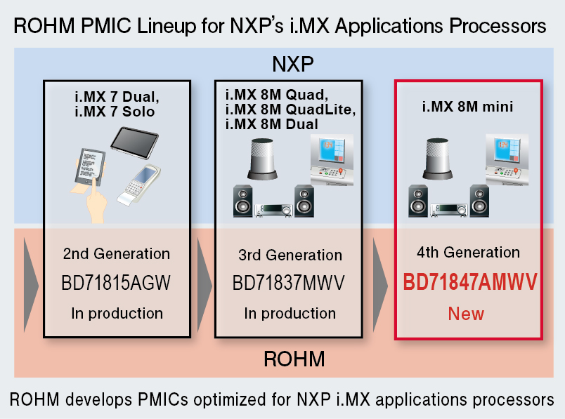 Kyoto and Santa Clara, Calif., April 25, 2019 (GLOBE NEWSWIRE) -- ROHM today announced the availability of BD71847AMWV, a highly integrated and efficient power management IC (PMIC) optimized for NXP® Semiconductors’ i.MX 8M Mini family of application processors, which features exceptional computing, audio, video, and graphics performance. BD71847AMWV is the latest addition to ROHM’s growing portfolio of PMICs designed for NXP’s i.MX application processors. With the BD71837MWV, which was introduced a year ago to support the high-performance i.MX 8M Quad and Dual applications processors, ROHM has power solutions for all members of the i.MX 8M family.