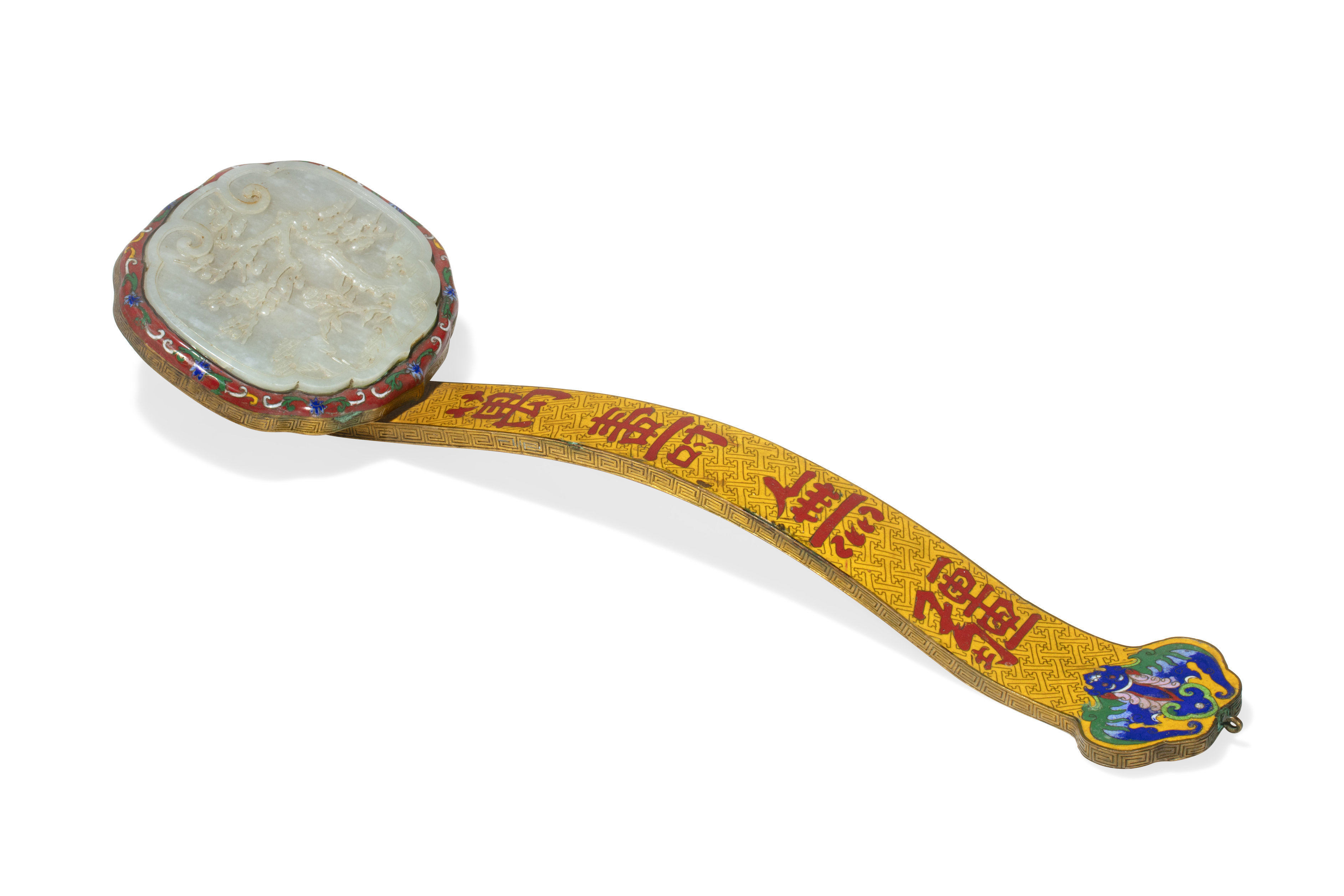 Chinese carved jade mounted cloisonné enamel ruyi scepter, post-1950 or possibly earlier, 18 ½ inches in length, from the estate of the late decorator Jack Levin (est. $1,000-$1,500).