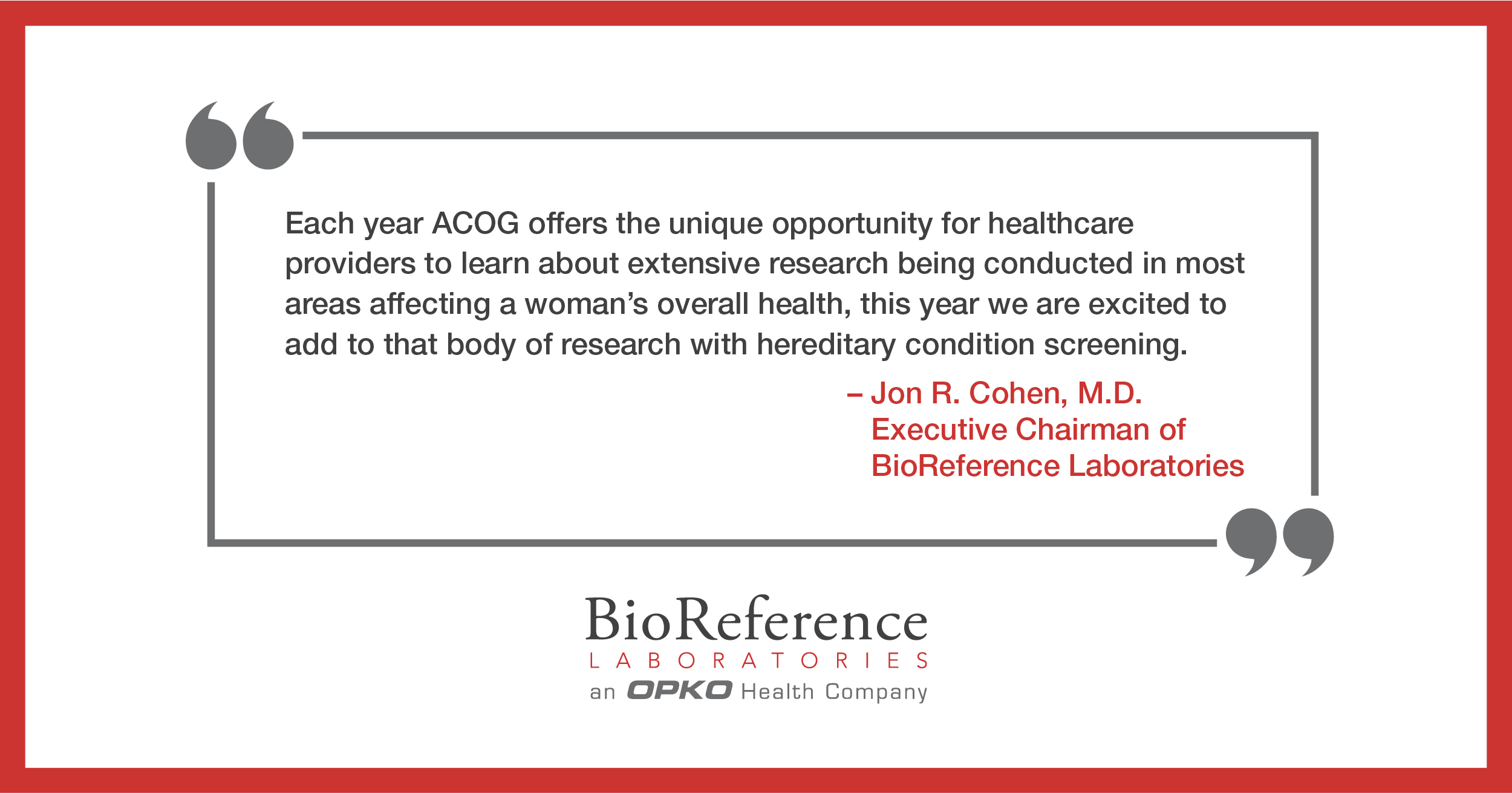“Each year ACOG offers the unique opportunity for healthcare providers to learn about extensive research being conducted in most areas affecting a woman’s overall health, this year we are excited to add to that body of research with hereditary condition screening,” said Jon R. Cohen, M.D., Executive Chairman of BioReference Laboratories.