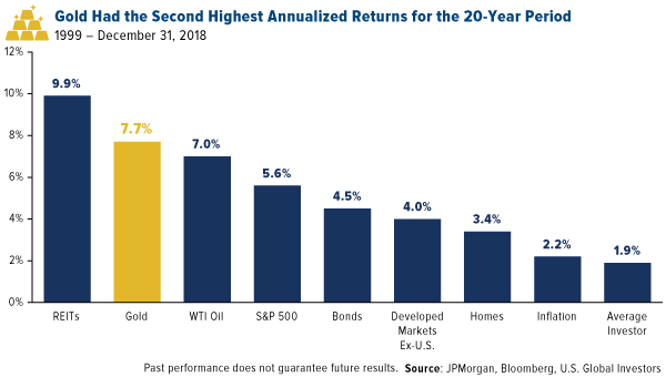 Because it has a low to negative correlation with the market, gold has helped investors diversify their portfolios and improve their risk-adjusted returns,” Holmes comments. “According to a recent report by JPMorgan Chase, gold had the second best annualized returns, at 7.7 percent, among a number of assets for the 20-year period through December 31, 2018. Only REITS (real estate investment trusts) did better at 9.9 percent.”