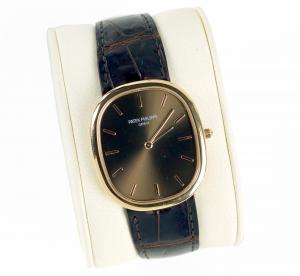 The handsome Patek Philippe 18kt yellow gold Calatrava men’s watch features a silver opaline dial and gold time markers, a 324 automatic 29-jewel movement, an 18kt yellow gold safety release clasp, Patek Philippe certificate and the original box (plus the aforementioned alligator bracelet). The watch, one of several Patek Philippes in the sale, should realize $8,000-$12,000.