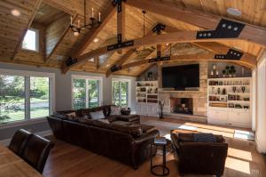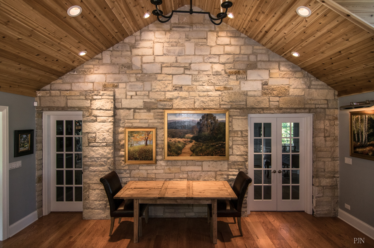 A large fireplace was the focal point at the end of the addition, which was designed to be wide enough and tall enough that the 90" TV would blend in seamlessly. Structural wood trusses were incorporated as a feature of the vaulted ceiling. The steel connections on the wood were painted black to accent structural integrity. Meanwhile, the exterior was completed with sourced stone out of Wisconsin that matched the existing stone. Gabled-end dormers were incorporated, trimmed and painted to match the existing dormers on the house ensuring the exterior components blend seamlessly with the existing characteristics of the house.