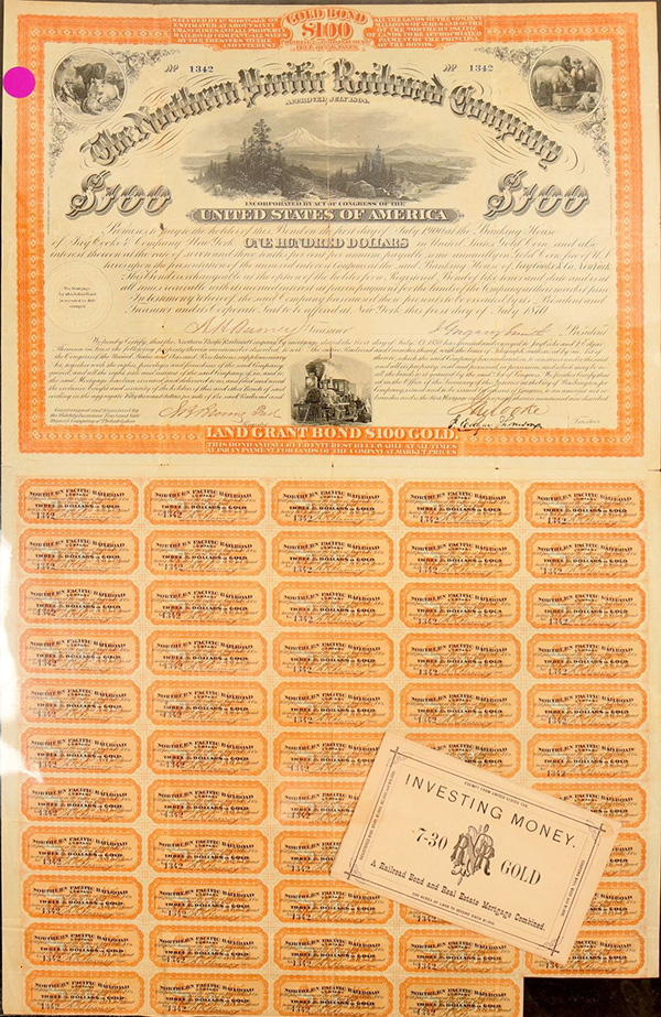 Northern Pacific Railroad Company $100, 7.3 percent, 30-year land grant tax-free gold bearer bond, due in 1900, issued July 1st, 1870, with an embossed seal and attractive vignettes. ($4,400).