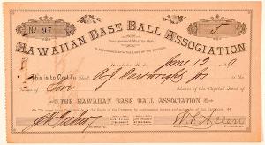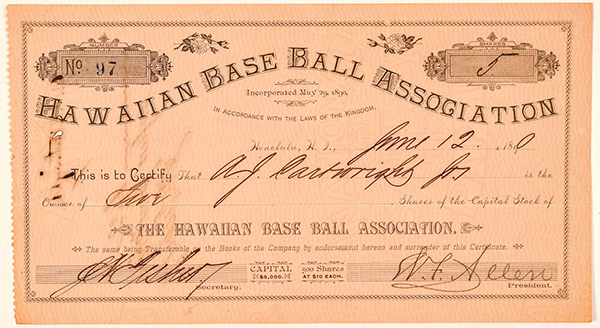 The Hawaiian Baseball Association stock certificate issued to baseball inventor A.J. Cartwright on June 12th, 1890, for five shares, was the day’s top lot. Cartwright signed the reverse. Also, a stock certificate for the Pacific Pearl Company (N.Y.) for 25 shares, from 1867, achieved $2,525. The company was a venture to harvest pearls and pearl shells in the Pacific Ocean. The Chief Engineer, Julius Kroehl, invented a submarine able to dive and re-surface on its own, in 1866.