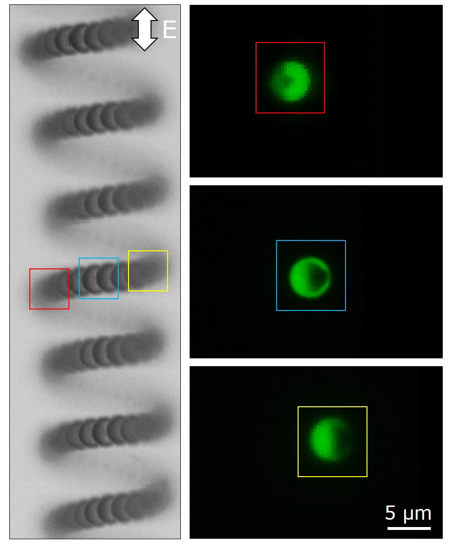 “We add a metal patch to the spherical particle in order to instruct it how to move in the electric field. We use the shape of the metal patch as a primitive encoding medium—different patch shapes encode different motions in the field. This paper shows that the geometry of the metal patch can be a useful encoding medium for programming different types of complex motions in self-propelled colloids.”