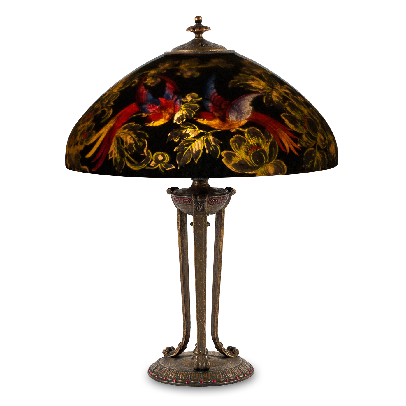 Handel table lamp (American, Meriden, Conn.) decorated with two pairs of exotic “birds of paradise” with blossoming branches, with signed 17 ¾ inch diameter shade (CA$10,030).