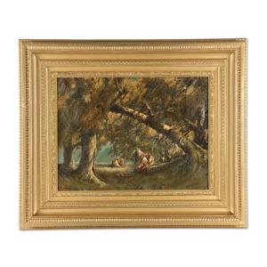 The oil on canvas painting by Homer Ransford Watson (Canadian, 1855-1936), depicted a forest scene featuring a group of subjects gathered in a clearing. The 24 inch by 18 ½ inch work (sight) was housed in the original frame and was signed “Homer Watson” lower left edge. The painting exhibited some craquelure (fine cracks to the surface), typical of Watson’s “heavy” oil paintings.
