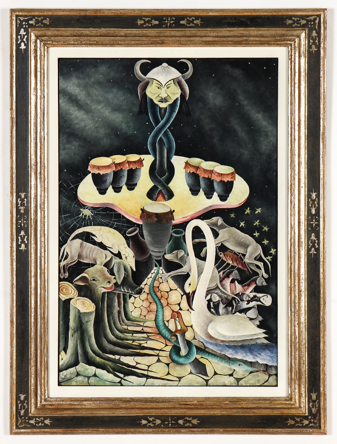 Jacques Enguerrand Gourgue (Haitian, 1930-1996) "Ritualistic Symbols", c. 1940-50, oil painting on cardboard, 25 ½ x 17 in., signed. Sold: $37,500 (Auction record)