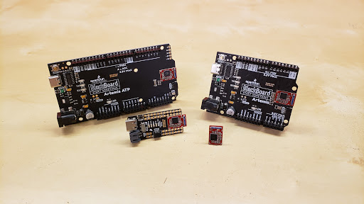 The SparkFun BlackBoard Artemis comes in the Uno footprint and is a good entry point for working with the Artemis module; the BlackBoard Artemis Nano is the smallest form factor of the three boards and offers great flexibility for smaller projects; and the Blackboard Artemis ATP ("all the pins") breaks out all 48 GPIO of the module and allows users to leverage the full capabilities of the module.