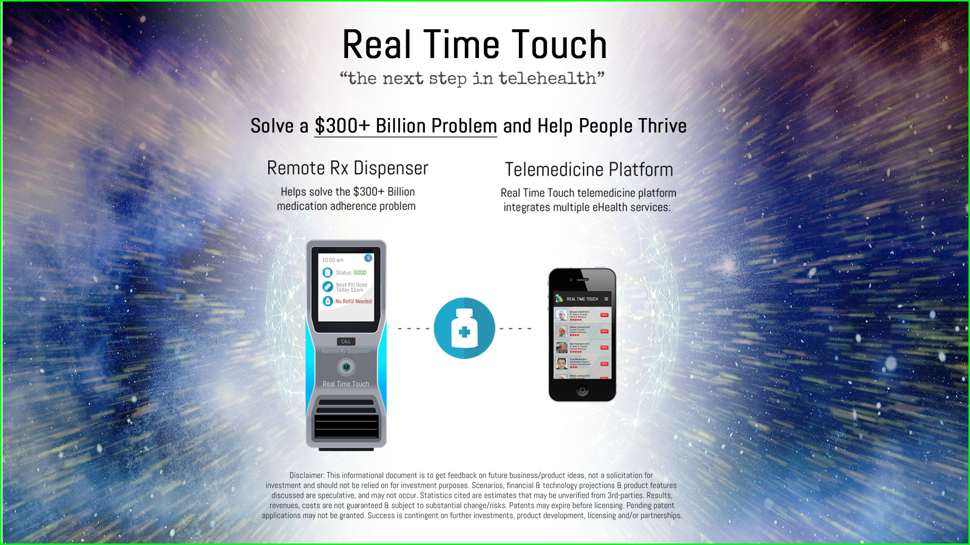RemoteRx is Real Time Touch’s medication adherence dispenser envisioned with advanced IoMT hardware, monitoring, biometric ID, cloud and physically augmented capabilities backed by Linden's patents. View more RemoteRx information: https://www.realtimetouch.com/remoterx/ A limited example of future Real Time Touch's based and/or wearable products are remote-controlled devices for pain-relief, laser, electronic, light, and magnetic treatments/therapies, imaging, sonograms, sample collections, adjusting implants and drug delivery.