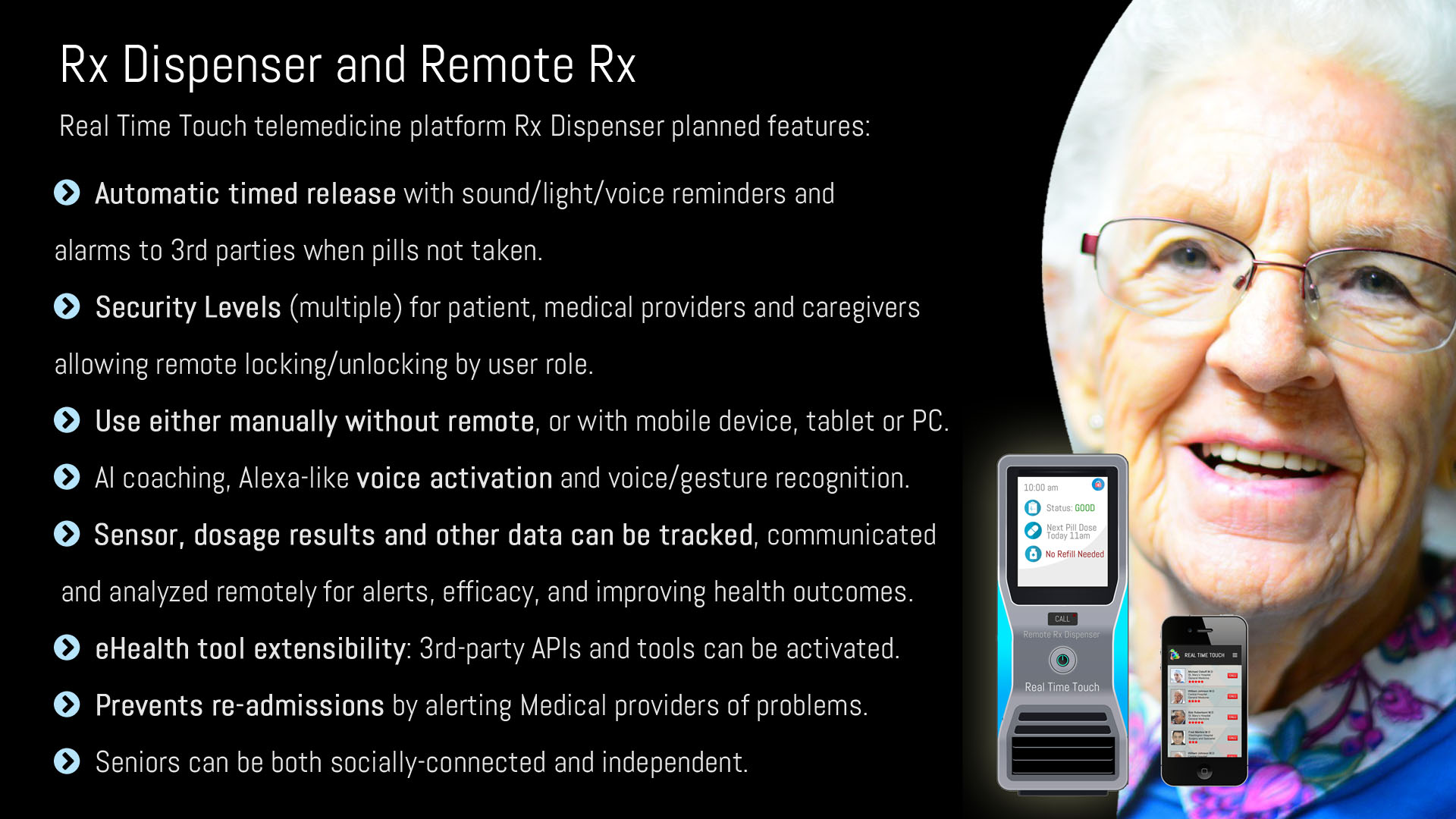 * Reducing Opioid Dependence: It's a US Federal Government priority to reduce opioid abuse. The advanced RemoteRx design is envisioned to include multi-level user/caregiver alerts, AI coaching, voice activation, gesture recognition, biomarkers, highest-grade HIPAA-compliant security, AR and Augmented Virtual Reality (AVR).
