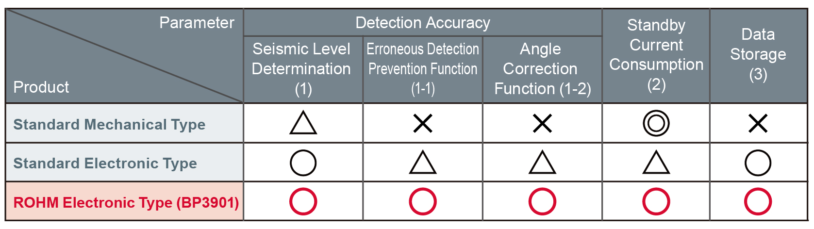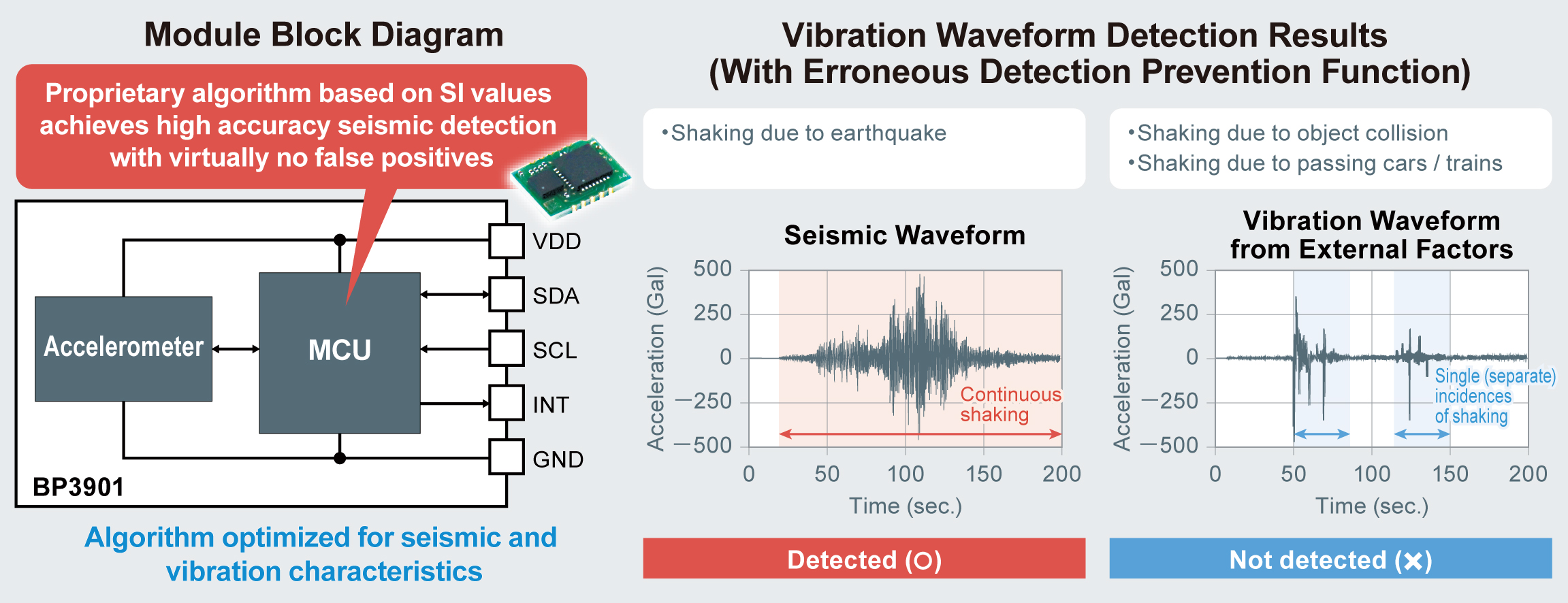 The BP3901 incorporates a 3-axis accelerometer (from ROHM Group company Kionix) in a compact 11.8 x 8.6 x 2.5mm module package. ROHM developed a unique algorithm focused on determining SI (Spectrum Intensity) values. This algorithm features a high correlation with measured seismic intensity data used for earthquake damage assessment while it also optimizes the digital signal processing of acceleration data and calculation parameters/sequence through analysis of measured excitation data. This makes it possible to accurately measure the seismic level, enabling more precise earthquake detection compared with conventional mechanical sensors.