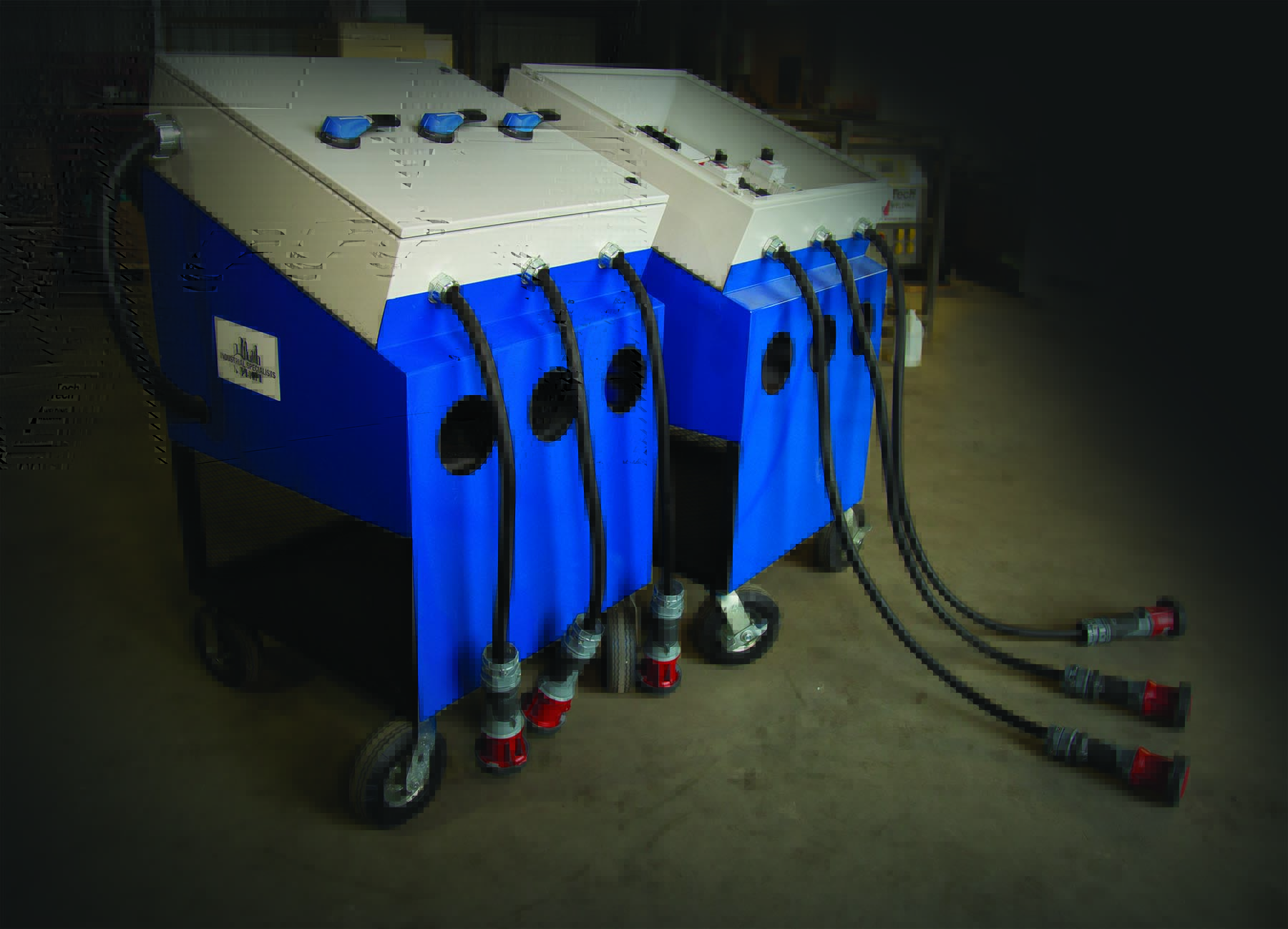 The BrandTech Power Distribution Unit uses a single installation to manage up to 200 amps of input and distribute it to three outputs of 480 volts/60 amps each making it compatible with an extensive array of equipment requiring 60 amps. Its flexible design means that a single PDU can be used with multiple machines in applications ranging from industrial painting to welding. The most common uses are with Blastrac and BrandTech™ Precision Welding.