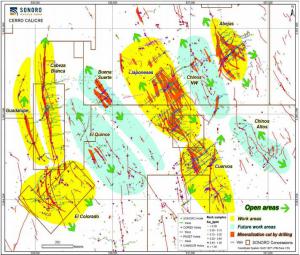 Southeast-Northwest trending vein structures litter the area, with disseminated gold between the gold structures. To date SMO.V has identified 17 mineralized clusters/zones on the Cerro Caliche property. The majority of drilling to date is concentrated on the central zones of Japoneses, Cuervos, and Abejas, and western central zones of Cabeza Blanca, Guadalupe, and El Colorado. The yellow shaded areas in the image above are the more advanced work areas, the Japoneses zone is most advanced with close spacing drill holes and is where the indicated resource is expected in the upcoming first-pass/maiden resource. See the full Mining Journal article for details on the average expected grade.