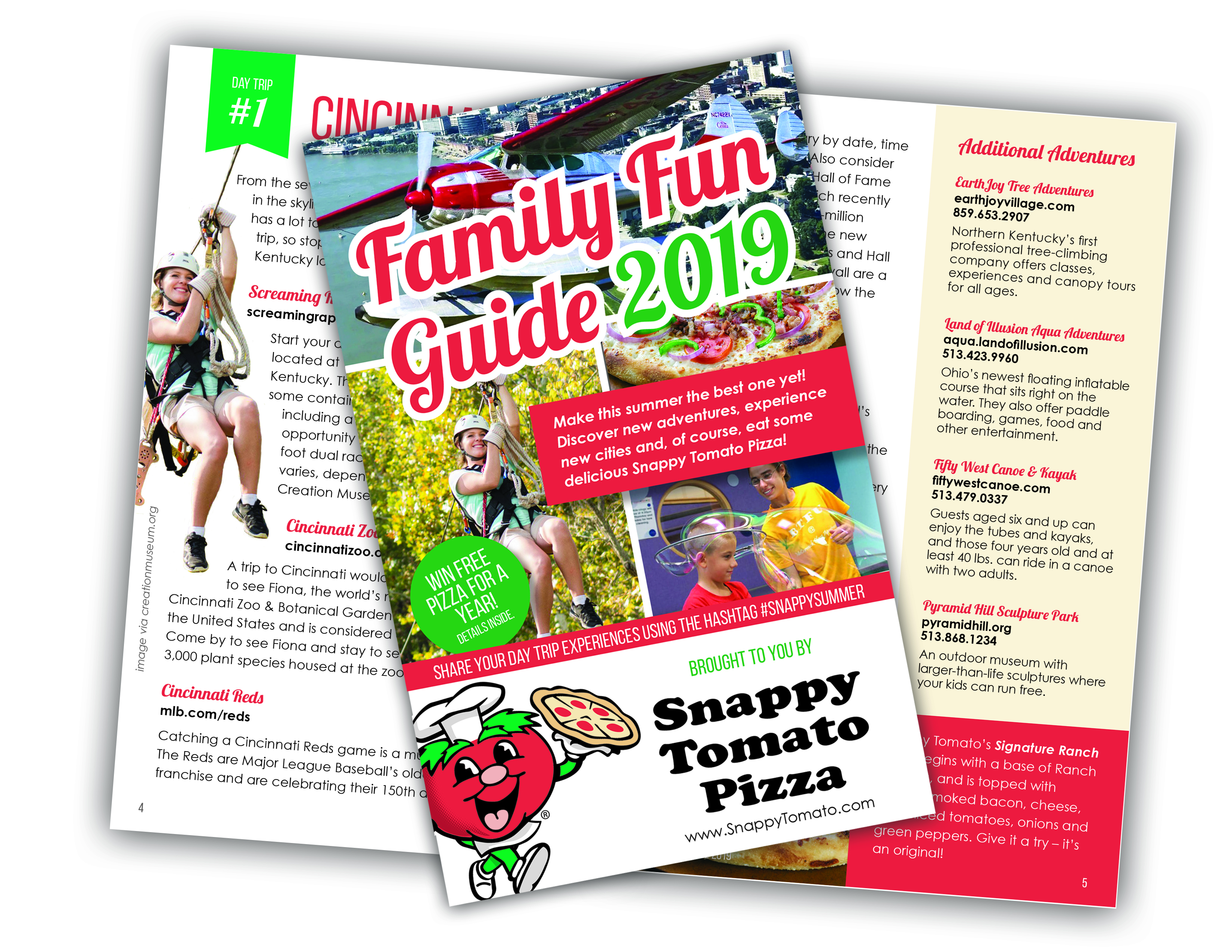 Each Family Fun Guide day trip is paired with their region’s favorite variety of Snappy Tomato Pizza. Together we present five fun day trips and five distinct pizza combinations: Cincinnati / Northern Kentucky features the Signature Ranch Pizza, Knoxville, Tennessee the Junior Beast Pizza, Adams County, Ohio the Snapperoni Pizza, Columbus, Indiana the award-winning Loaded Potato Pizza, and Rising Sun, Indiana the Snappy Veggie Pizza. In addition to pizzas, all Snappy Tomato Pizza locations offer a diverse menu of salads, wings and hoagies for carry out and delivery, and some locations have dine-in areas as well.