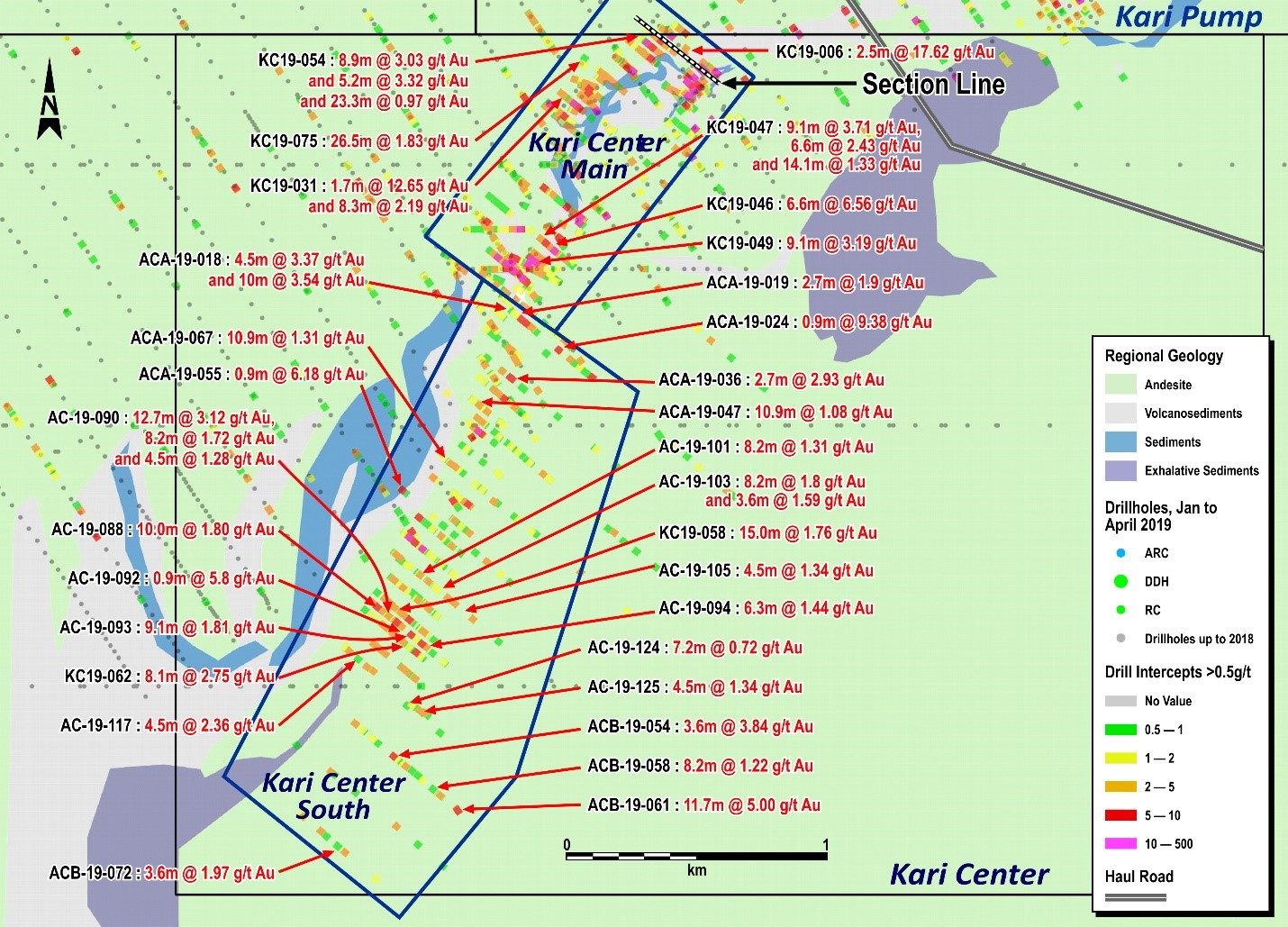 - KC19-046: 6.6m at 6.56 g/t Au (including 3.3m at 11.64 g/t Au from 9.00m)