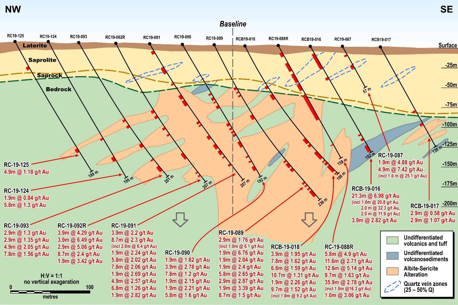 - RC-19-088R: 12.6m at 5.14 g/t Au (including 1.94m at 9.72 g/t Au)