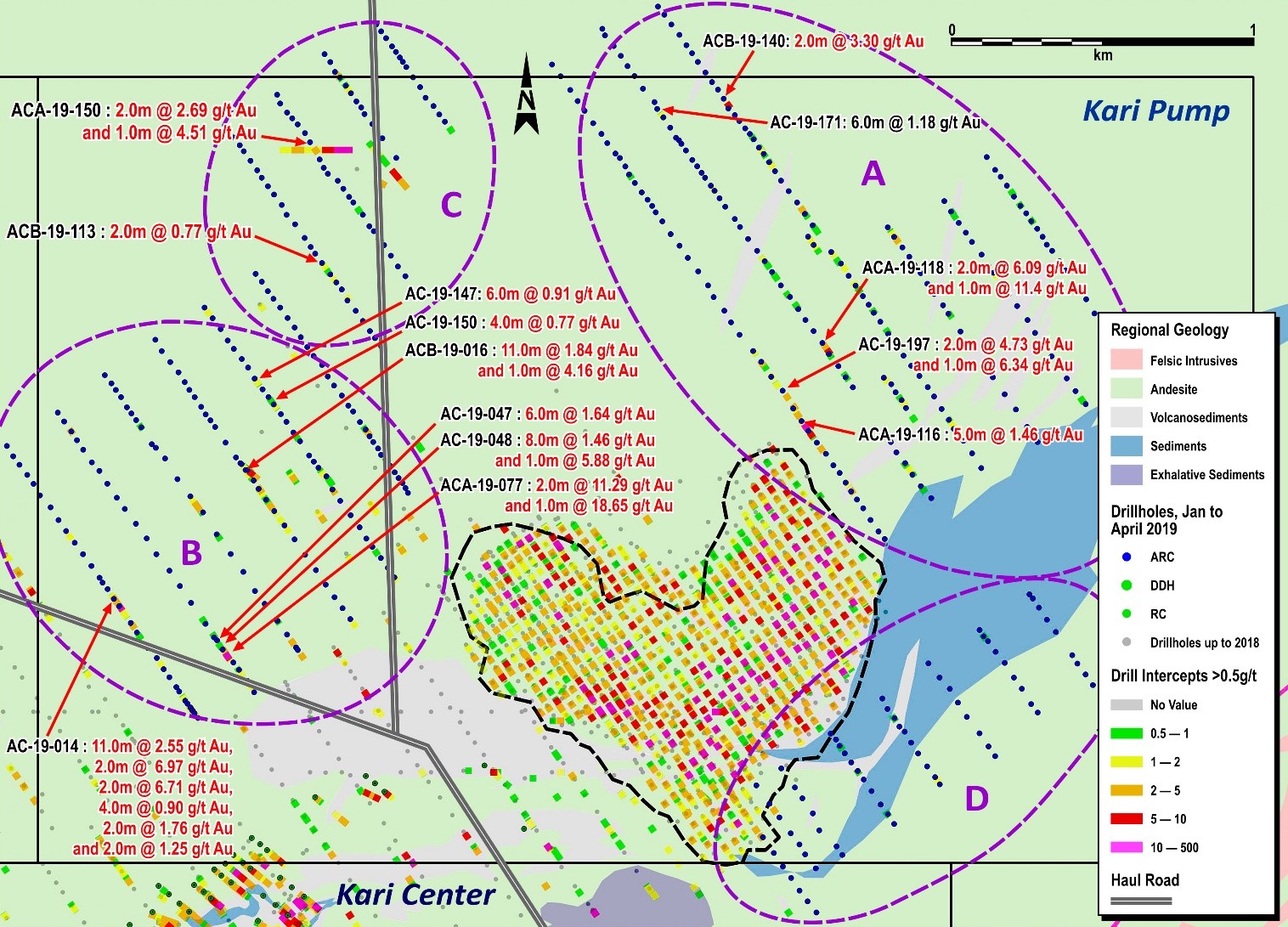 Drilling campaigns in 2017 and 2018 successfully delineated the Kari Pump maiden resource and related reserves over an area 1,300 meters long by 800 meters wide, with mineralization open towards the northwest, northeast, east and south. The ongoing 2019 drilling campaign is focused on testing the extensions of the Kari Pump mineralization, as illustrated in Figure 4 below with Zones A, B, C, and D.