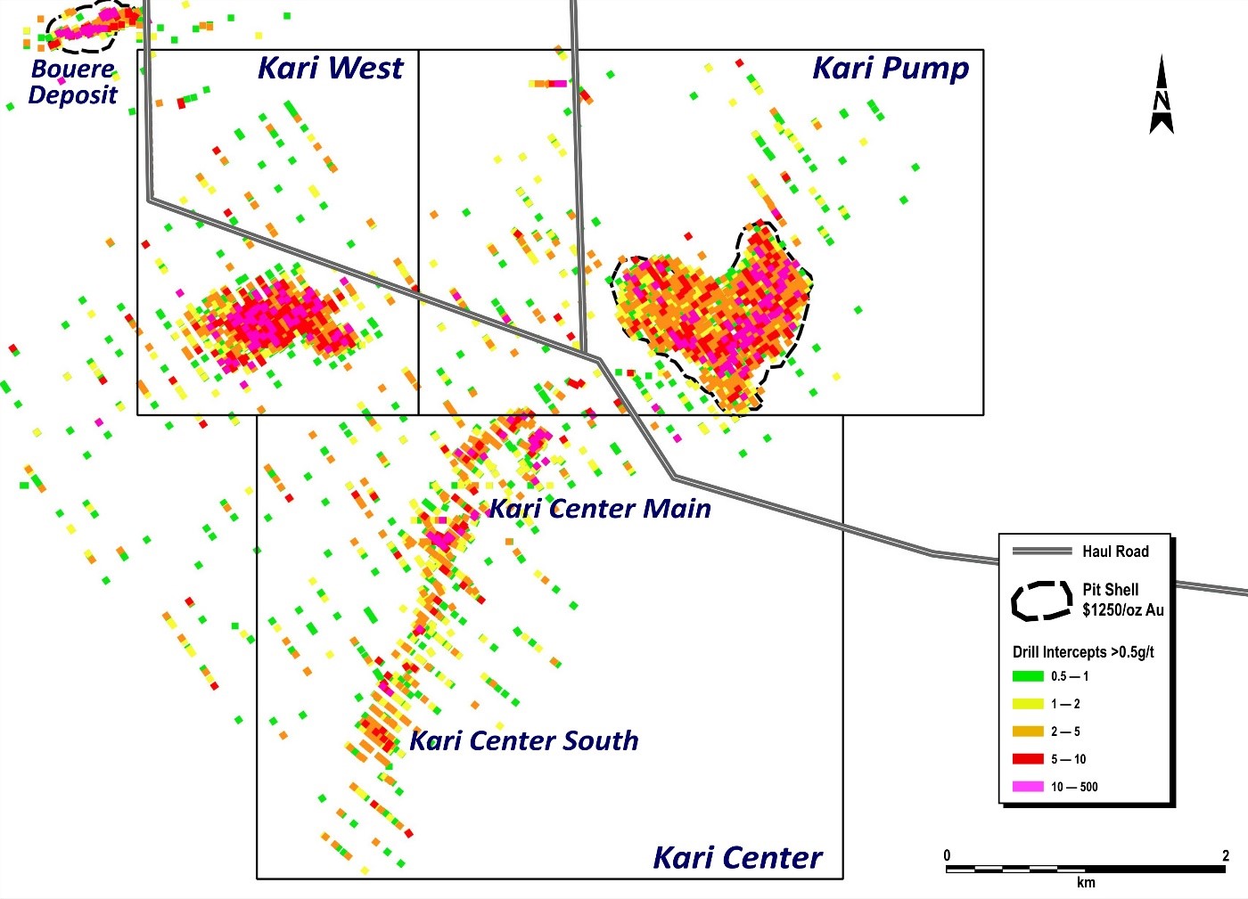 - Kari Pump (where a 0.7Moz at 3.01 g/t Au reserve was recently delineated) near-surface mineralization was extended 700m to the northeast and 900m towards Kari West, and remains open