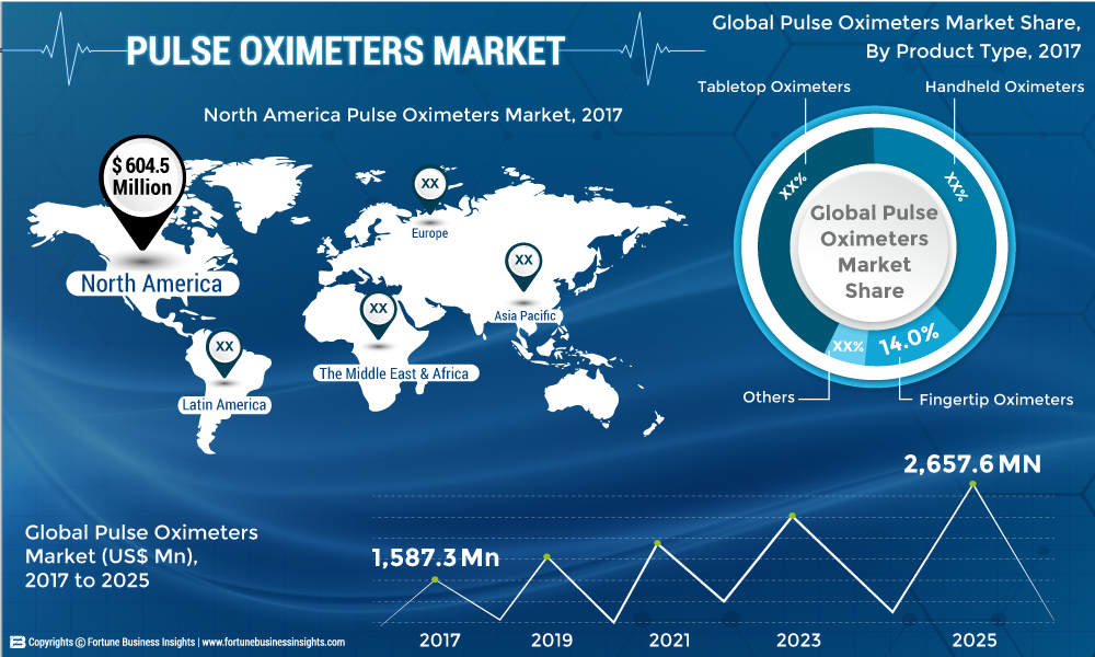 Pune, July 03, 2019 (GLOBE NEWSWIRE) -- The global Pulse Oximeters Market is likely to grow in the coming years due to increasing usage clearances from the Food and Drug Administration (FDA). According to a report published by Fortune Business Insights, titled “Pulse Oximeters Market: Global Market Analysis, Insights and Forecast, 2018-2025,” the market is likely to reach US$ 2,657.6 Mn by the end of 2025. Fortune Business Insights states that the market was valued at US$ 1,587.3 Mn in 2017 and will exhibit a CAGR of 6.7% in the forecast period.
