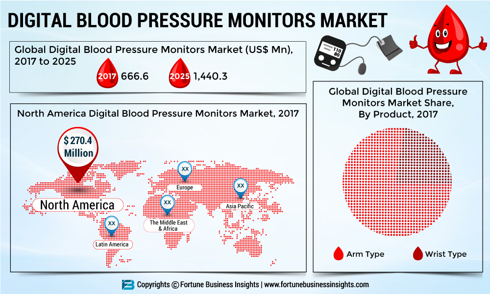 Pune, July 03, 2019 (GLOBE NEWSWIRE) -- The global Digital Blood Pressure Monitors Market is expected to gain from increasing incidence of chronic diseases worldwide. Recently Fortune Business Insights published a report, titled “Digital Blood Pressure Monitors Market Size, Share and Global Trend by Product Type (Arm Type & Wrist Type), End User (Hospitals, Ambulatory Surgical Centers & Clinics, Homecare Settings & Others) and Geography Forecast till 2025,” shading light into various factors responsible for the growth in the market. According to the report, in 2017 the global digital blood pressure monitors market was valued at US$ 666.6 Mn. The global market is expected to progress at a CAGR of 10.1% and reach US$ 1440.3 Mn by the end of 2025. The report classifies the global Digital Blood Pressure Monitors Market in terms of various segments.