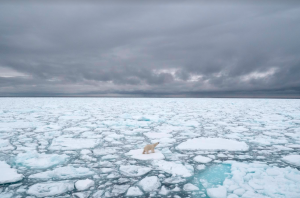 A lone polar bear stands on Arctic sea ice. Increasing temperatures have caused longer ice-free seasons in recent years and is a direct threat to polar bears who rely on it to survive. ©BJ Kirschhoffer/polarbearsinternational.org.