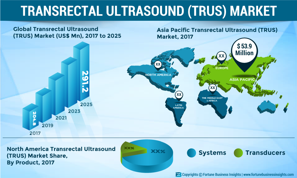 Pune, July 15, 2019 (GLOBE NEWSWIRE) -- The increasing incidence of prostate cancer especially among aging men is the key driver of the global transrectal ultrasound (TRUS) market. This was found by Fortune Business Insights in a report, titled “Transrectal Ultrasound Market Size, Share and Global Trend by Product (Systems, Transducers), Type (Cart/Trolley Based, Portable), Application (Diagnostic, Image-guided Treatment), End User (Diagnostic Laboratories, Hospitals) and Geography Forecast till 2025”. Fortune Business Insights predicts the global TRUS market to exhibit a CAGR of 4.5% during the forecast period. Furthermore, in 2017, the market was valued at US$ 204.8 and is anticipated to reach US$ 291.2 Mn by the end of 2025.