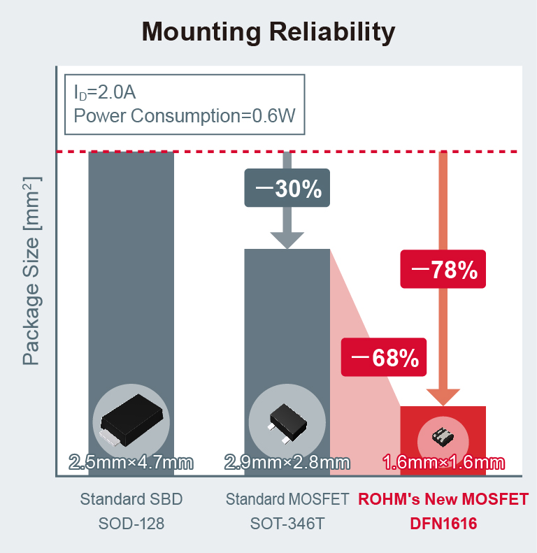 For example, at a current and power consumption of 2.0A and 0.6W, respectively, conventional automotive MOSFETs can reduce mounting area by 30% over SBDs. However, adopting bottom electrode MOSFETs capable of providing excellent heat dissipation while still supporting large currents in an even smaller form factor makes it possible to decrease mounting area by as much as 78% compared with conventional SBDs and by as much as 68% compared with conventional MOSFETs.