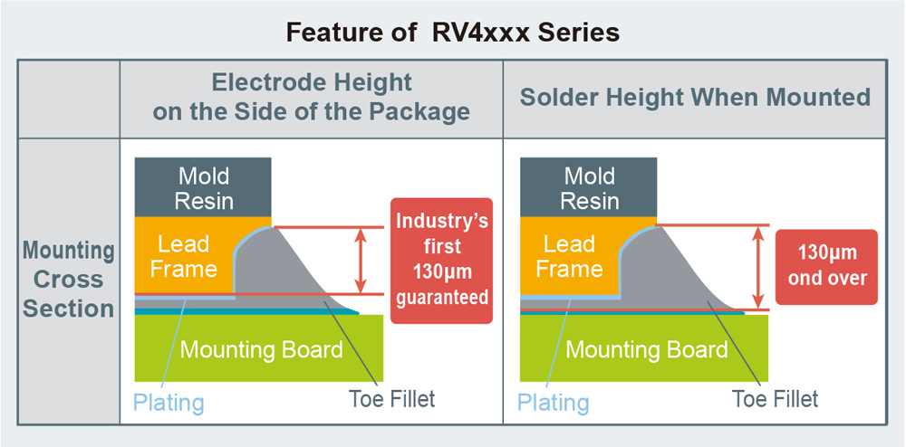 However, for automotive applications optical inspection is performed during the assembly process to ensure quality, but in the case of bottom electrode components solder height cannot be verified after mounting, making it difficult to confirm mounting conditions.