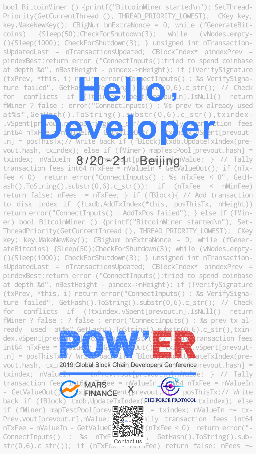 SINGAPORE, July 31, 2019 /EINPresswire.com/ -- The Force Protocol & Mars Finance will co-host “POW’ER 2019 Global Blockchain Developers Conference” from August 20, 2019 to August 21, 2019 in Beijing.In 2019, blockchain has become a spot for the Internet industry, financial services and other industries. The top companies start to concentrate on the application of blockchain technology patents, for example, financial giant JP Morgan has launched Quorum platform, the king of social network Facebook has released Libra project. A new technology wave triggered by blockchain has attracted the attention of the world.