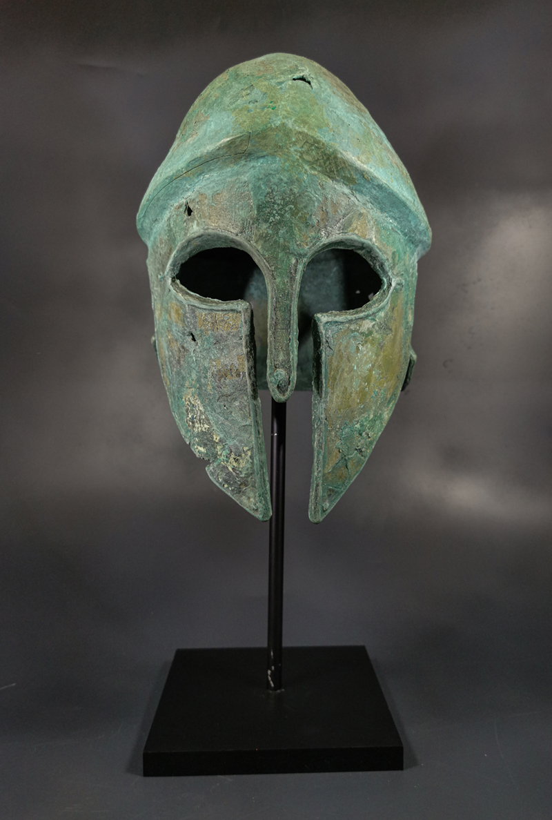 Greek Corinthian bronze helmet belonging to Spartan warrior. Wide nose guard and broad cheek pieces, circa 600 BC. Estimate £30,000-£50,000 ($37,500-$62,250)