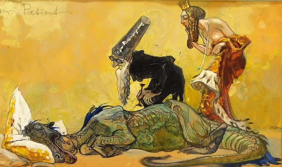 The painting by Heinrich Kley (German, 1863-1945), is a mythical illustrative work titled Der Patient. It depicts an ill dragon resting on a pillow stuffed with gold, as a wizard inspects his wound and a bare-breasted woman with a worried look stands beside him. The piece, signed “Kley” and titled, is 8 ½ inches by 13 inches, with a 12 inch by 16 inch mat (est. $3,000-$5,000).