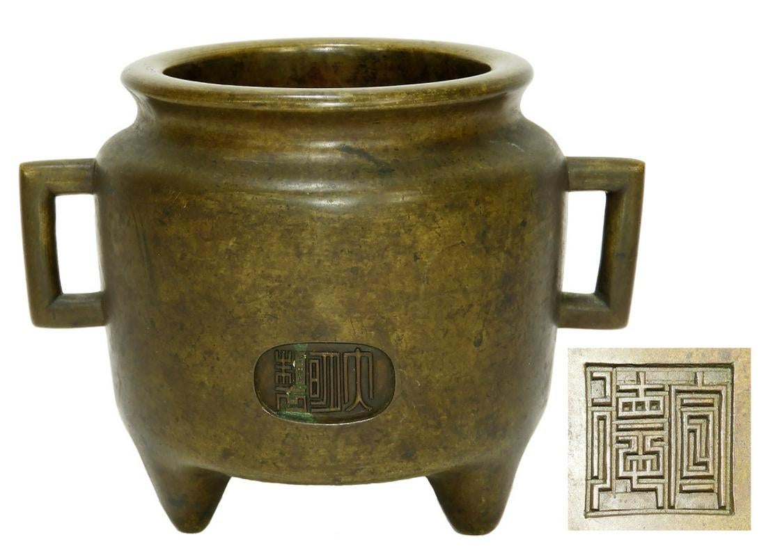 18th century Chinese Qing dynasty bronze tripod censer, used to burn incense to honor ancestors, purify the air or cure ailments. with the Xuande character seal mark (est. $3,000-$5,000).
